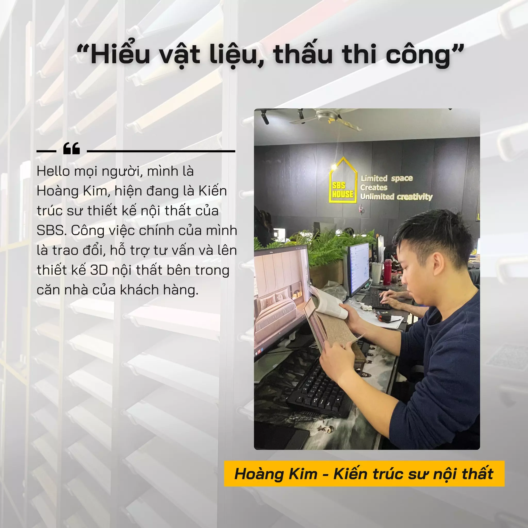 Hello mọi người, mình là Hoàng Kim, hiện đang là Kiến trúc sư thiết kế nội thất của SBS. Công việc chính của mình là trao đổi, hỗ trợ...