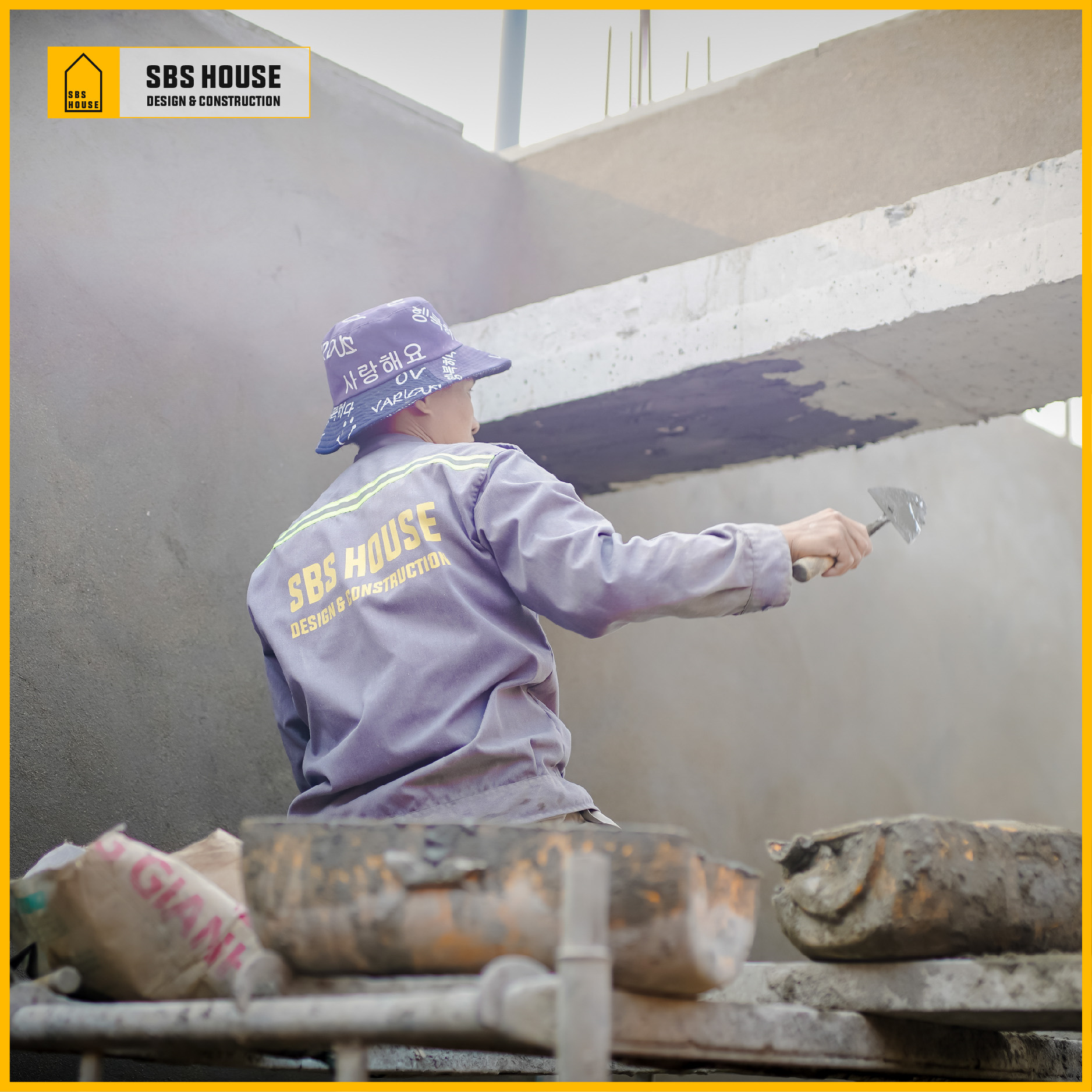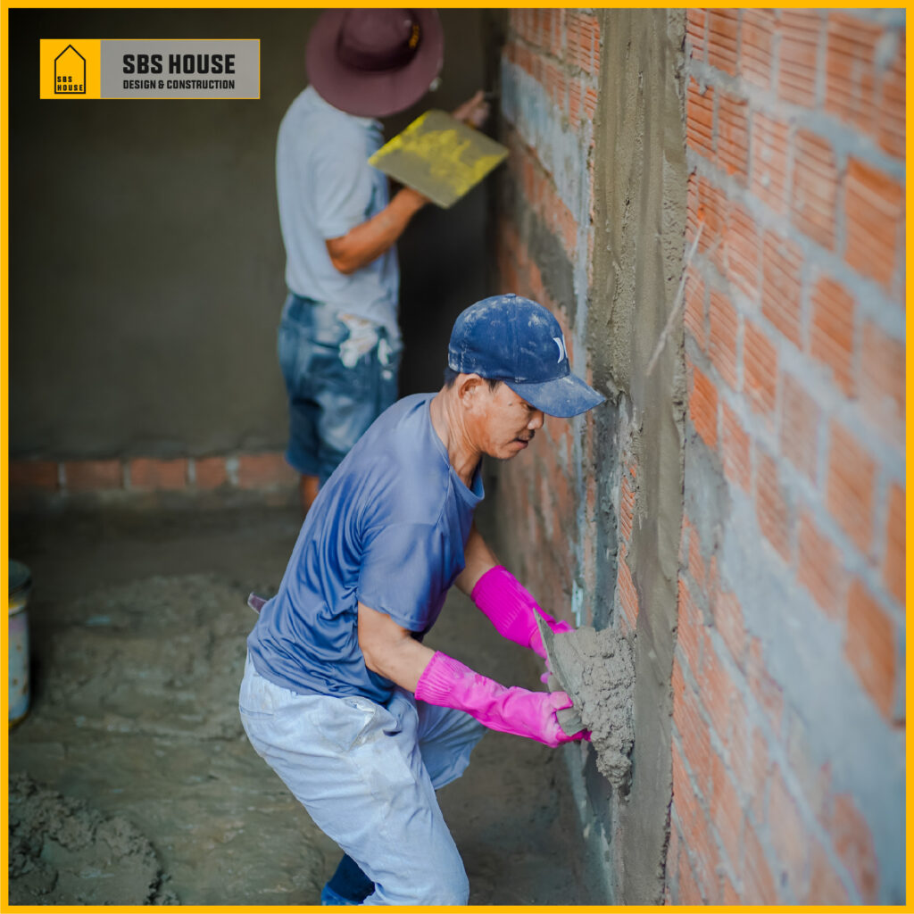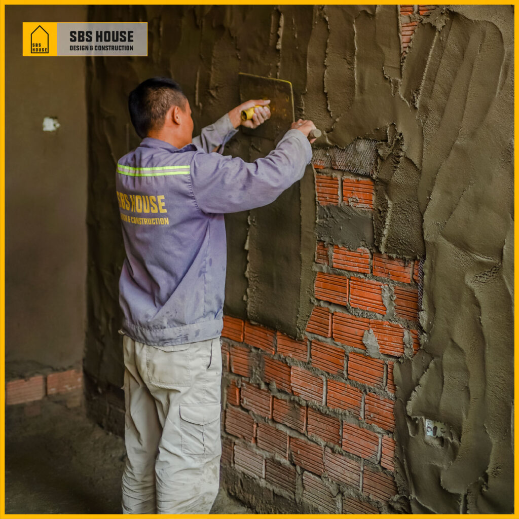 Ở SBS HOUSE, chúng tôi áp dụng những quy trình rõ ràng cho việc thi công. Chẳng hạn như việc tô (trát) tường sẽ thực hiện sau khi ghém tường, đi hệ thống ME điện chôn đế toàn bộ ngôi nhà, lưới cáo được đóng vào các vị trí cần thiết như vị trí đục đi ống điện, vị trí tiếp giáp, rồi mới tô lớp ngoài.