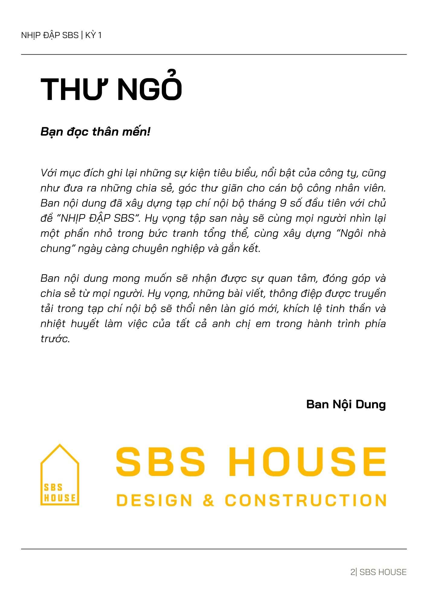 Đây là ấn phẩm mang giá trị tinh thần to lớn mà Ban Nội Dung mong muốn gửi tới toàn thể thành viên nhà SBS. Không những giúp chúng ta lưu giữ kỷ niệm trong suốt thời gian làm việc và gắn bó tại đây, Tạp chí nội bộ còn như một món quà tinh thần để chúng ta biết, hiểu về nhau và về SBS hơn trong một tập thể sẽ ngày càng đông và lớn mạnh hơn nữa.