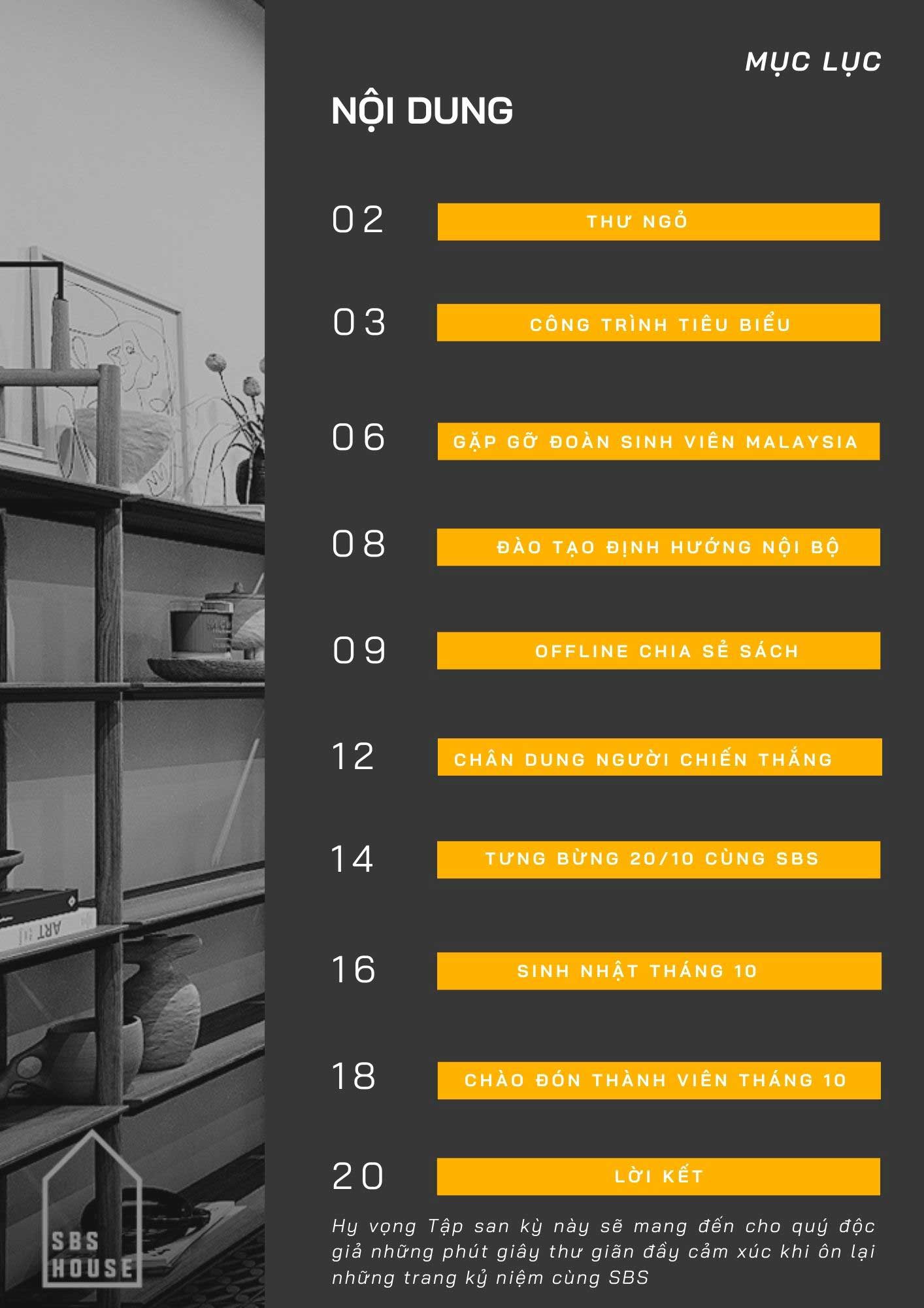 Ban Nội Dung gửi vào ấn phẩm này lời tri ân chân thành nhất tới tất cả SBSer- những bạn đọc đã đồng hành trong thời gian vừa qua. Sự hỗ trợ và chia sẻ của tất cả mọi người sẽ giúp Ban Nội Dung sáng tạo hơn nữa, đem đến những “món ăn tinh thần” ngày càng chất lượng và nhiều màu sắc.