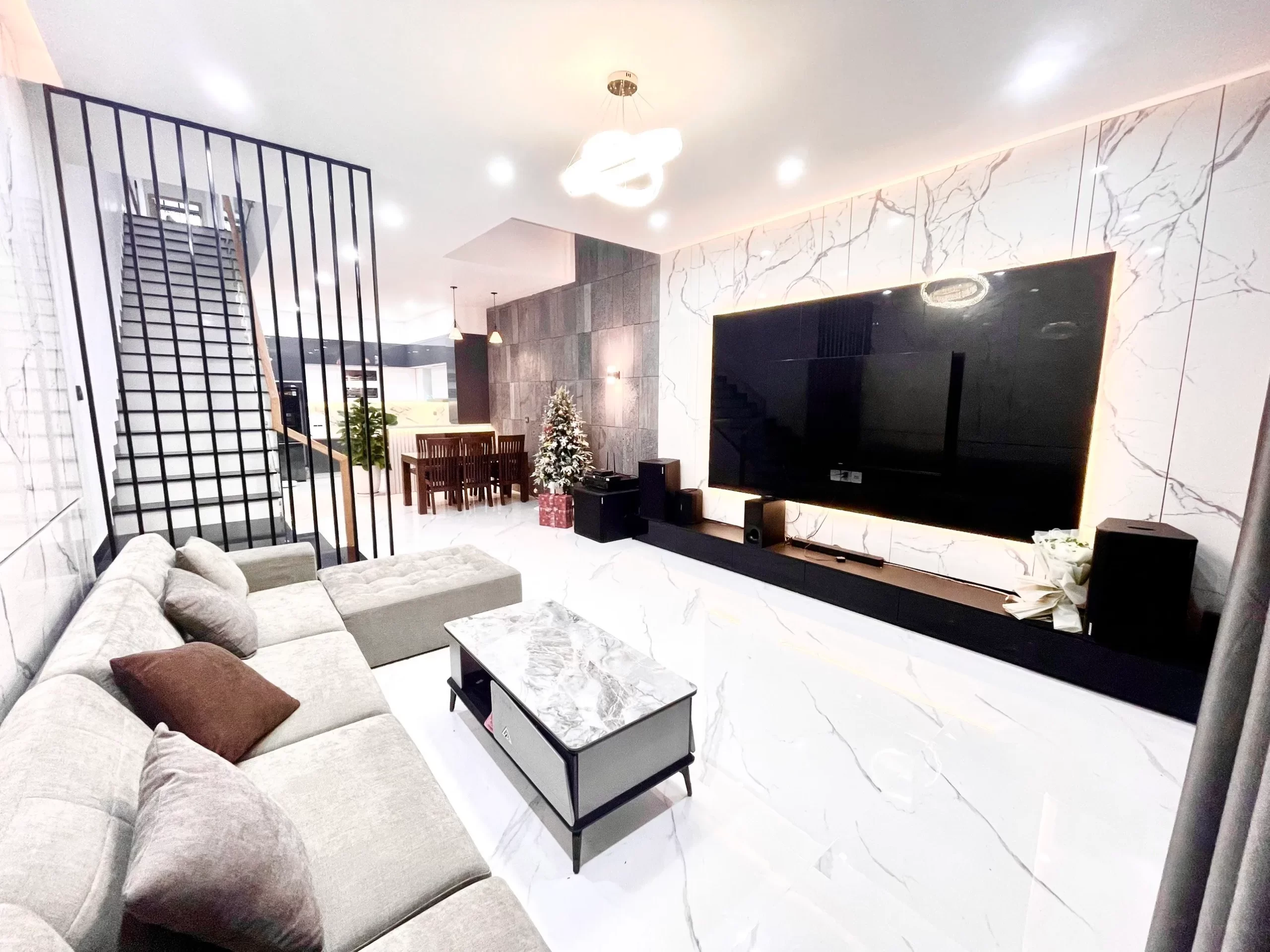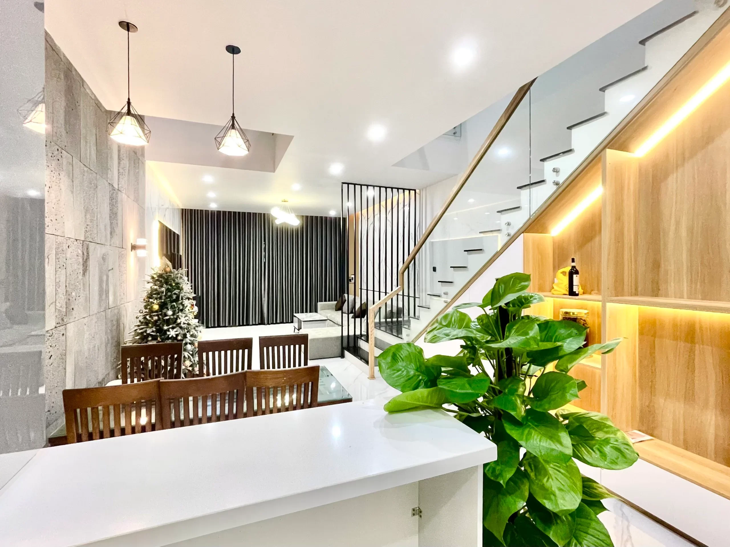 Phòng khách được thiết kế liền khu vực bếp – ăn, đây là một giải pháp để cơi nới không gian hiệu quả. Mang đến sự gắn kết và rộng mở cho hai khu vực sinh hoạt chung này. Các thanh ngăn đặt ở khu vực cầu thang là lựa chọn hợp lý để việc di chuyển thuận lợi nhưng vẫn đảm bảo tính thẩm mỹ của tổng thể.