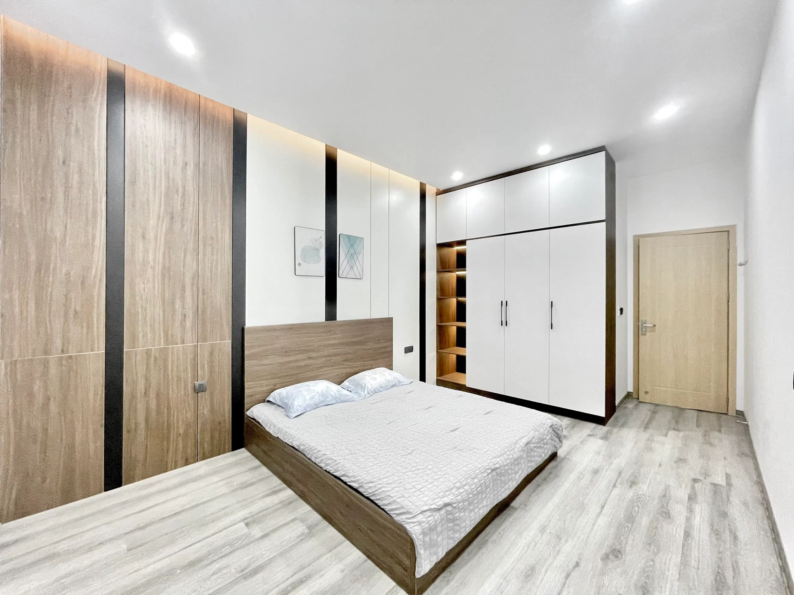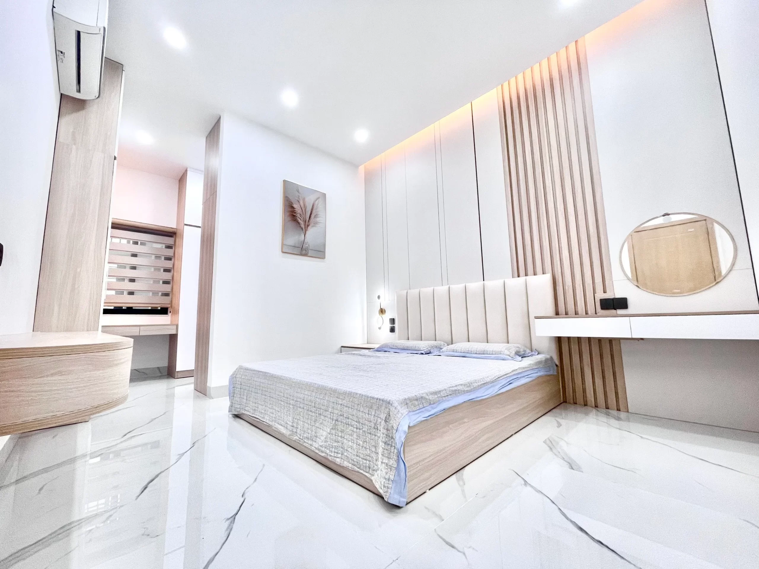 Phòng ngủ rộng rãi với tone gỗ ấm cúng hòa trong màu trắng tinh tế. Một không gian lý tưởng để người ở tận hưởng những giây phút riêng tư của mình.