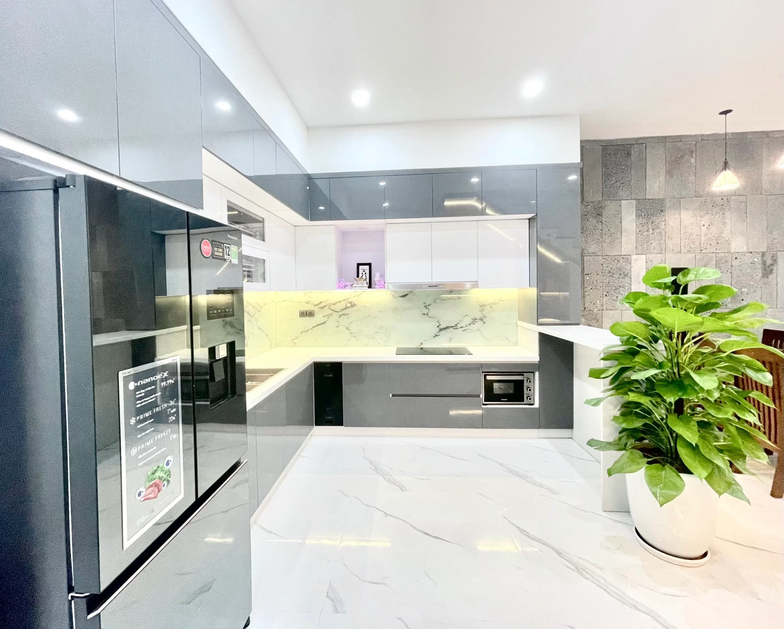 Phòng bếp ngăn nắp khi bố trí các kệ tủ lớn đảm bảo việc lưu trữ đồ dùng và sử dụng hằng ngày. Một chậu cây xanh cũng được đặt ở đây, giúp tăng thêm sự tươi tắn và không khí trong lành cho vị trí này.