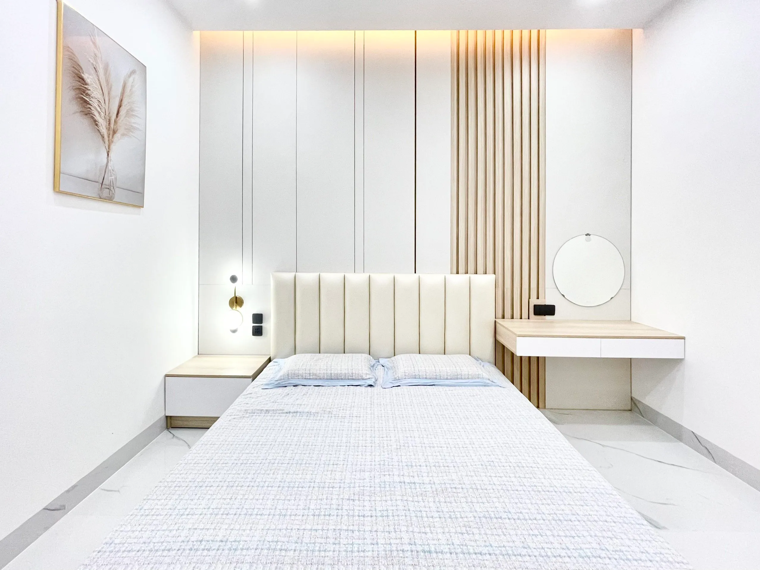 Phòng ngủ tone sáng tạo nên cảm giác thoải mái và thư giãn cho người ở. Bàn trang điểm với thiết kế đơn giản, làm tăng sự gọn gàng. Để thêm điểm nhấn thẩm mỹ, tranh treo tường và đèn trần thả tab đầu giường được đặt vào không gian.