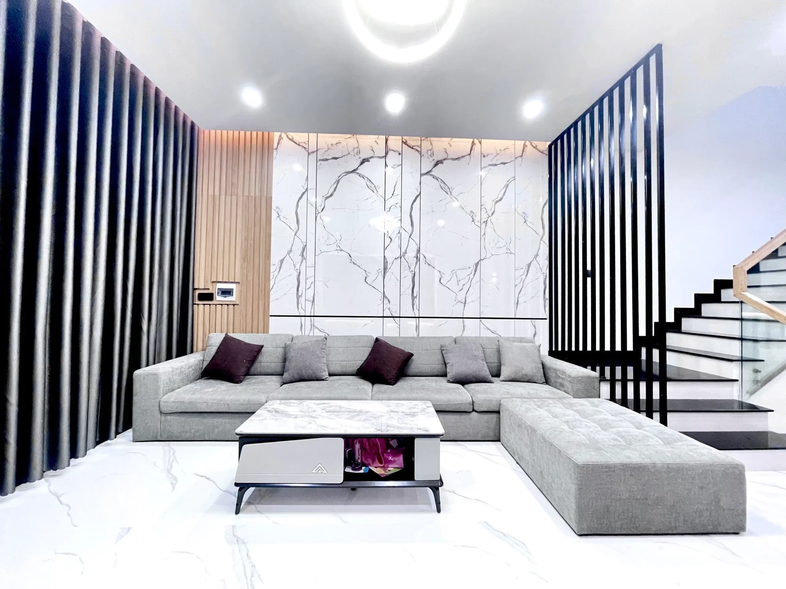 Tone xám được chọn cho bộ sofa khi đặt ở không gian phòng khách với gam màu sáng. Vừa hòa quyện hoàn hảo nhưng cũng làm nổi bật sự khéo léo trong việc sắp đặt bố cục.