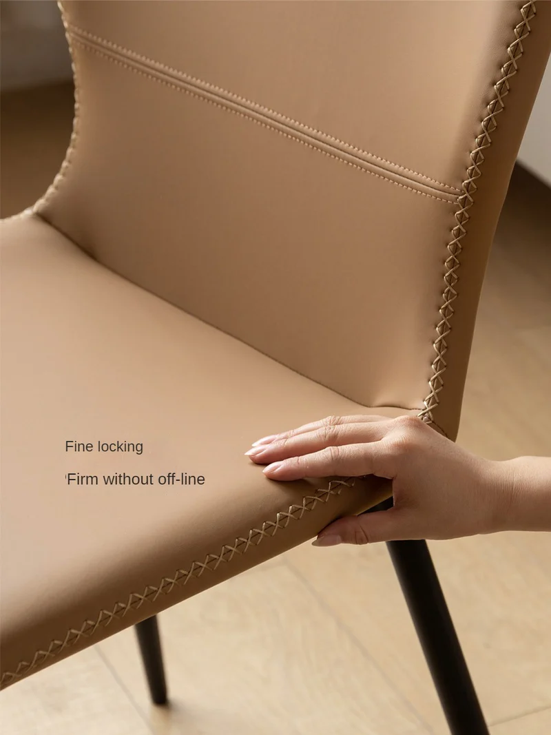 Ghế được thiết kế với đường may tỉ mỉ, tạo nên điểm nhấn tinh tế dọc theo viền ghế. Phần chân ghế được làm từ kim loại chắc chắn, với thiết kế mở góc độc đáo (outer eight legs), giúp ghế bám sàn tốt và giữ thăng bằng tuyệt vời, tránh tình trạng lắc lư. Sự kết hợp giữa chất liệu da nhân tạo và khung kim loại tạo nên vẻ ngoài thanh lịch, sang trọng, mà vẫn đảm bảo sự ổn định, an toàn khi sử dụng.