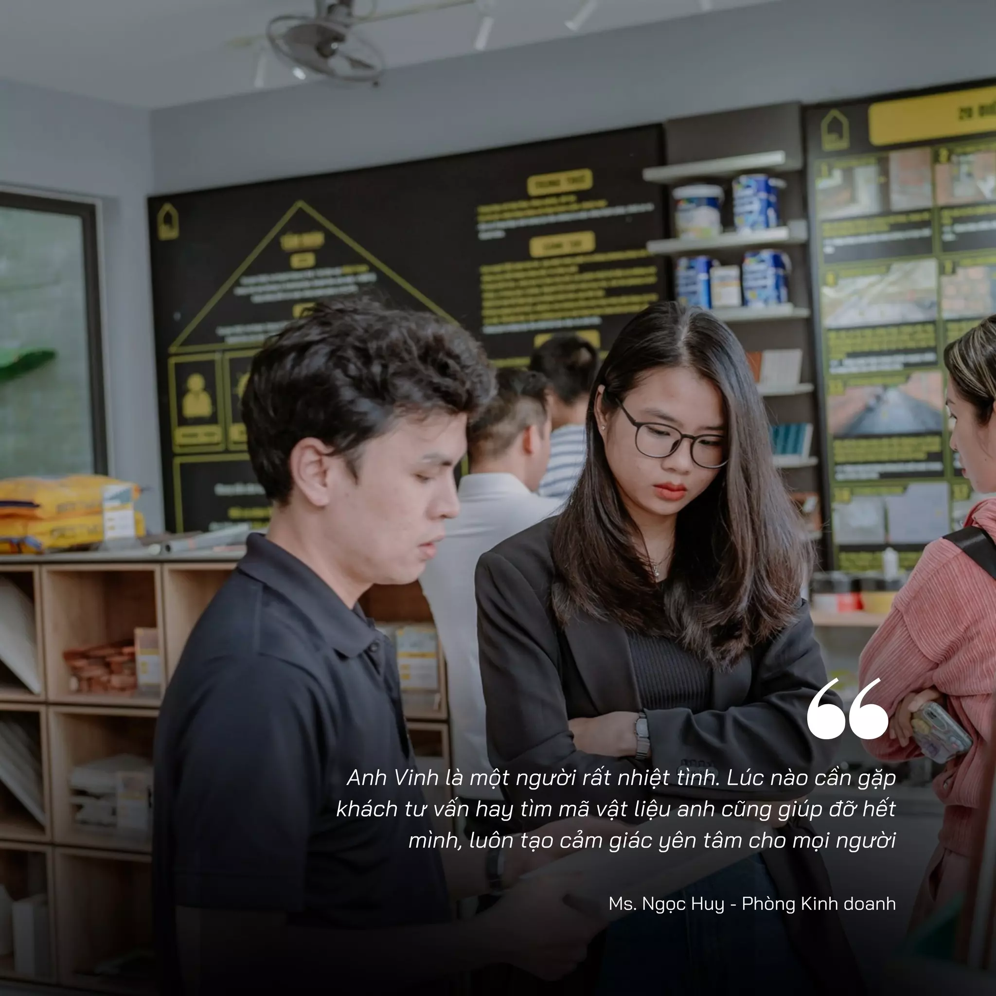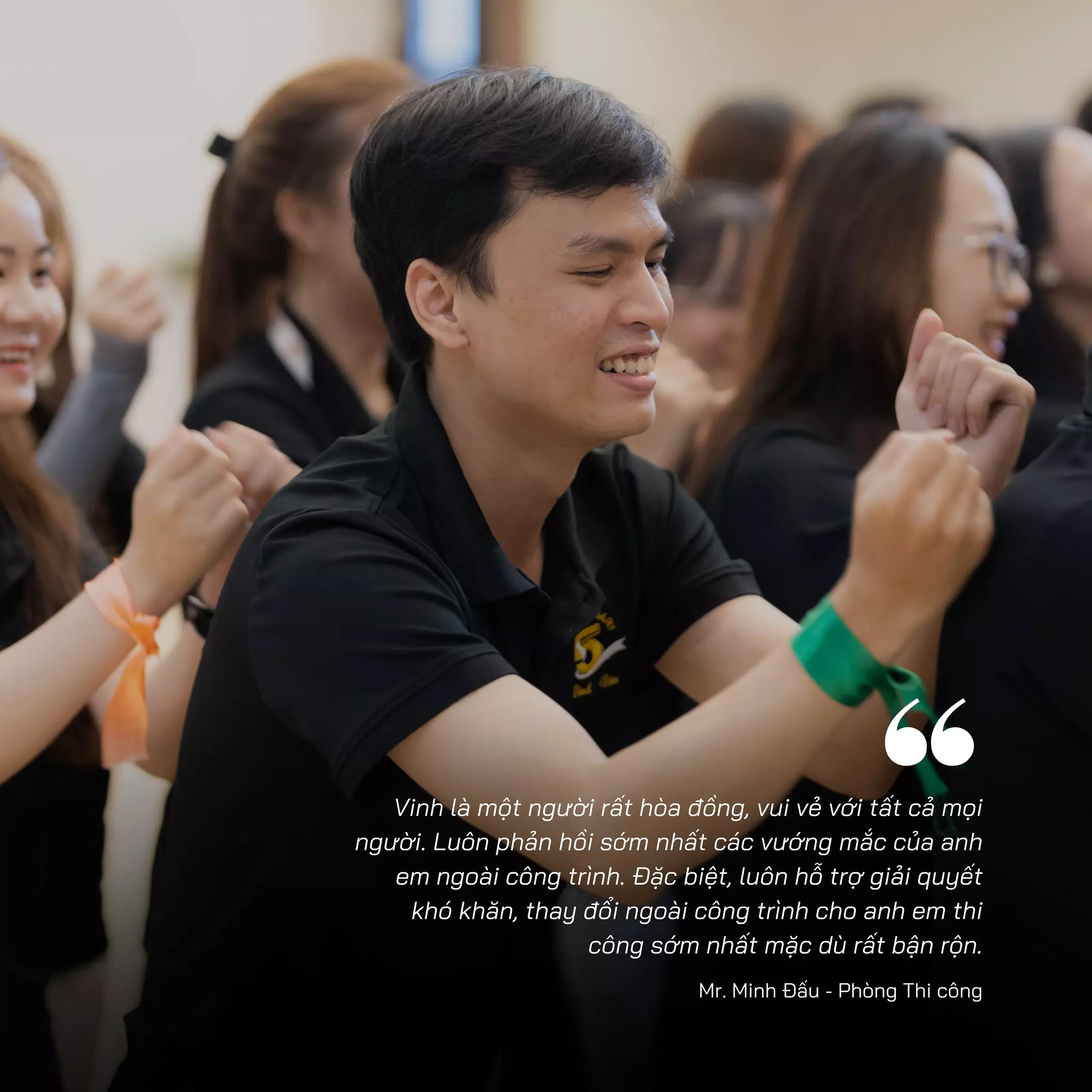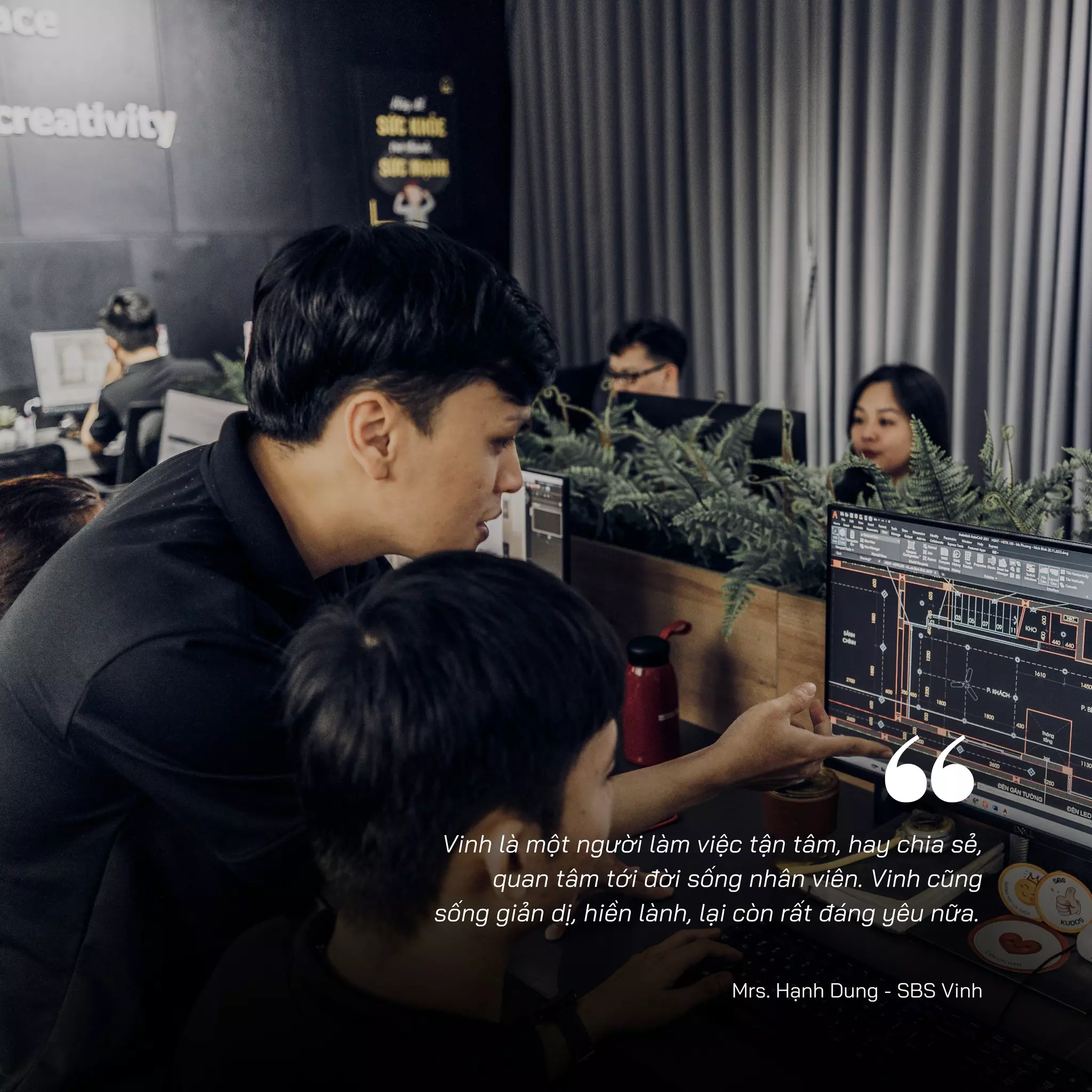 Hơn thế, SBS nhìn nhận rằng với vai trò là một người quản lý, người dẫn dắt, Vinh luôn là cầu nối đặc biệt để gắn kết mọi người. Không phải qua một phương thức hay công thức nào, mà bằng sự chân thành, tấm lòng và những tình cảm anh muốn gửi gắm. Từ khi còn là leader team Nội thất cho đến vị trí trưởng hay phó phòng sau này, anh vẫn giữ được phong cách gắn kết ấy, giúp các thành viên trong team hiểu nhau và gắn bó hơn.