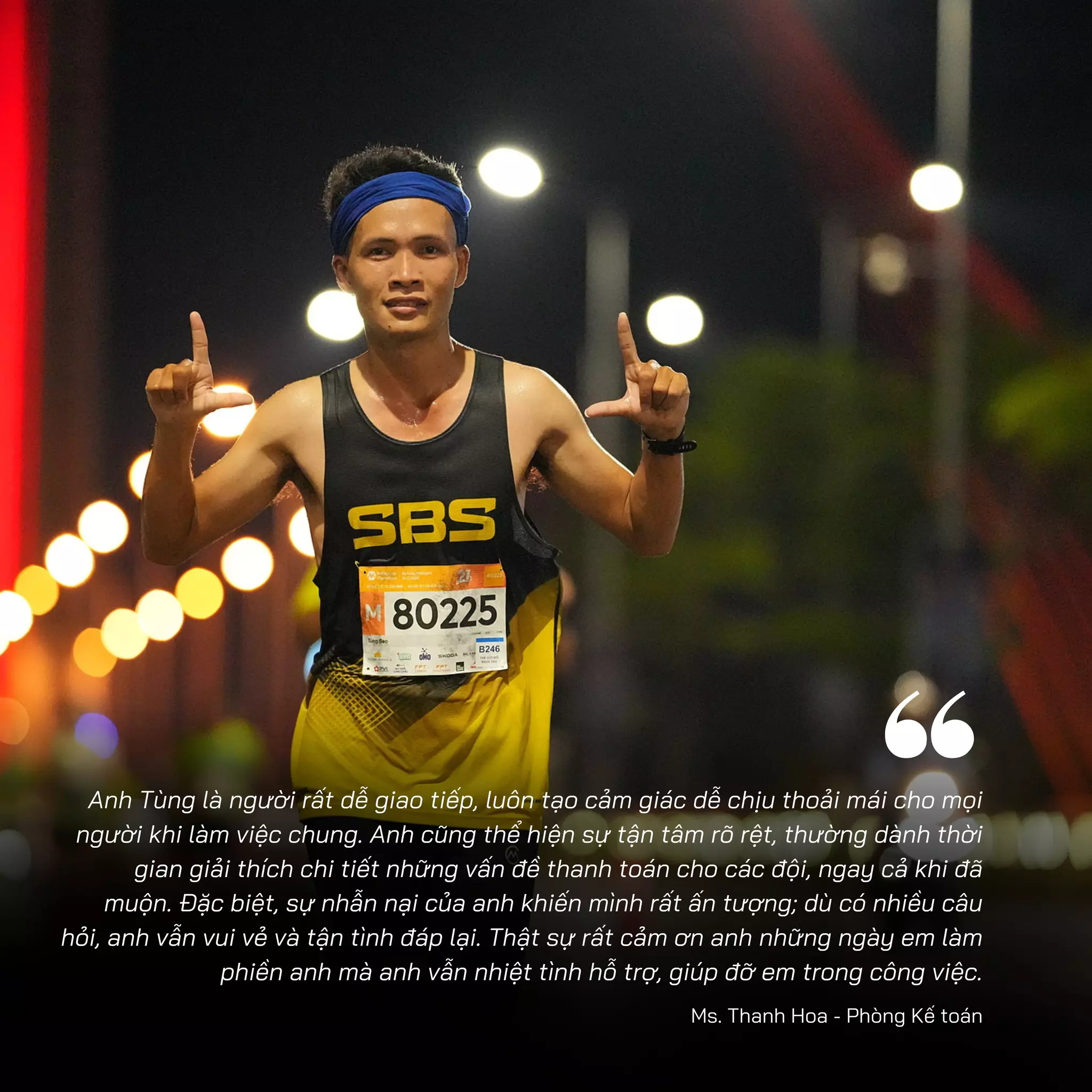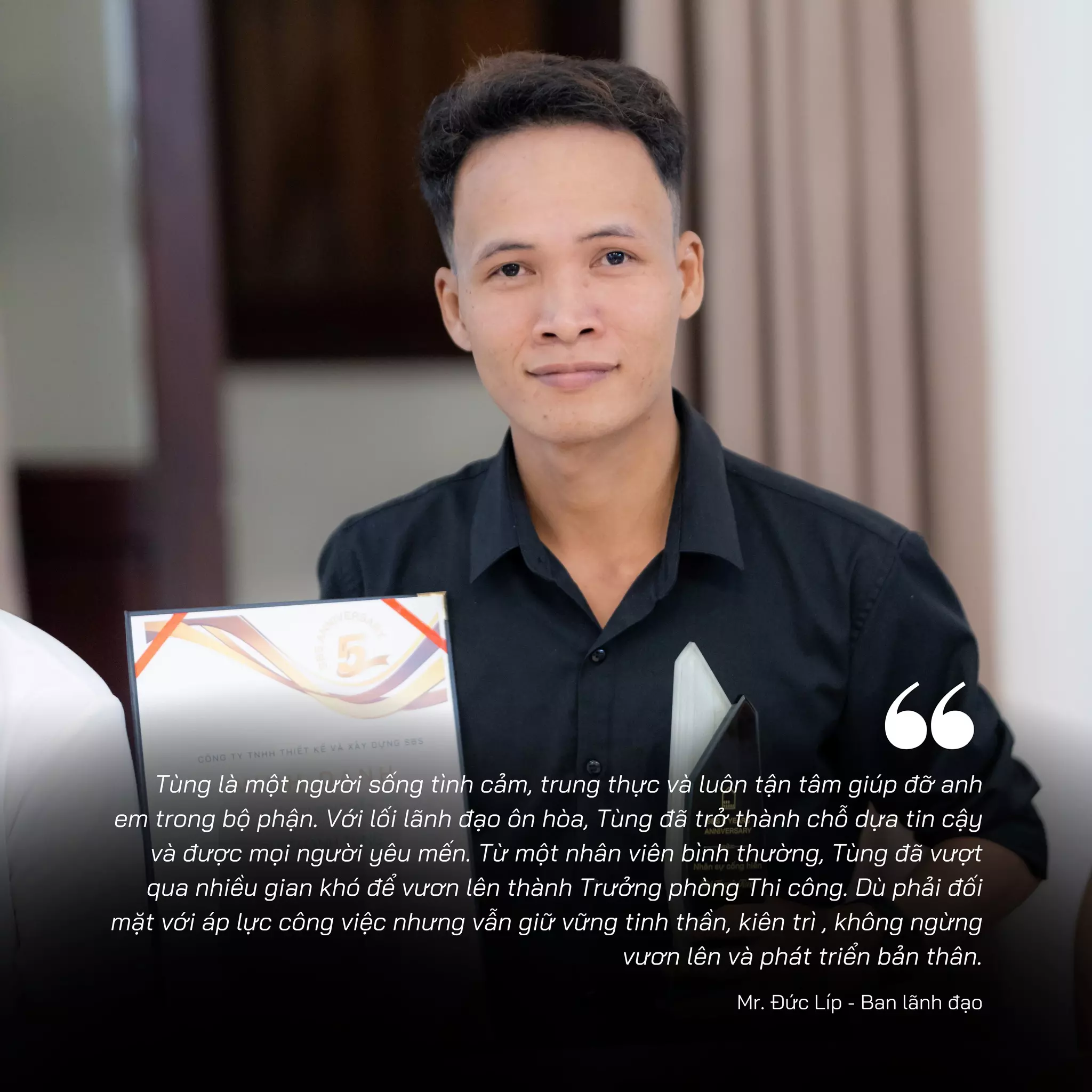 Anh Líp – người đồng hành cùng Tùng từ những ngày đầu đến với SBS đã có những chia sẻ rằng: “Tùng là một người sống tình cảm, trung thực và luôn tận tâm giúp đỡ anh em trong bộ phận. Với lối lãnh đạo ôn hòa, Tùng đã trở thành chỗ dựa tin cậy và được mọi người yêu mến. Từ một nhân viên bình thường, Tùng đã vượt qua nhiều gian khó để vươn lên thành Trưởng phòng Thi công. Dù phải đối mặt với áp lực công việc nhưng vẫn giữ vững tinh thần, kiên trì và không ngừng vươn lên và phát triển bản thân.”