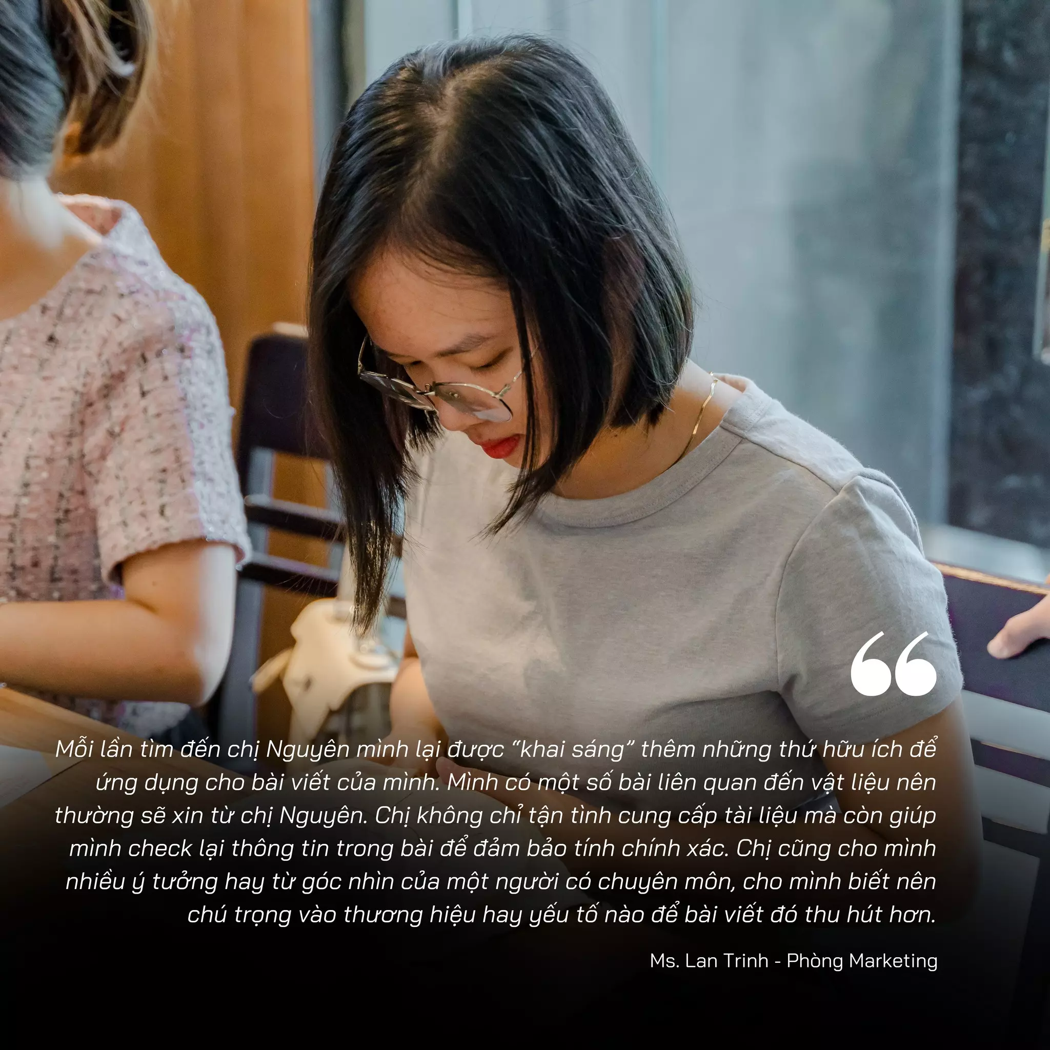 Đâu đó còn là những giá trị, phẩm chất quý giá từ chị trong hành trình ấy. Một tinh thần sẵn sàng hỗ trợ mọi người, sẵn lòng chia sẻ kiến thức và kinh nghiệm để đồng đội cùng tiến bộ. Luôn giữ vững mục tiêu, không ngừng nỗ lực hoàn thành công việc với kết quả cao nhất. Đồng thời là tấm gương về sự chuyên nghiệp và trách nhiệm. Từng chi tiết nhỏ đều được chăm chút cẩn thận để tạo nên sản phẩm, dịch vụ tốt và thể hiện trách nhiệm với công việc, với đồng nghiệp.