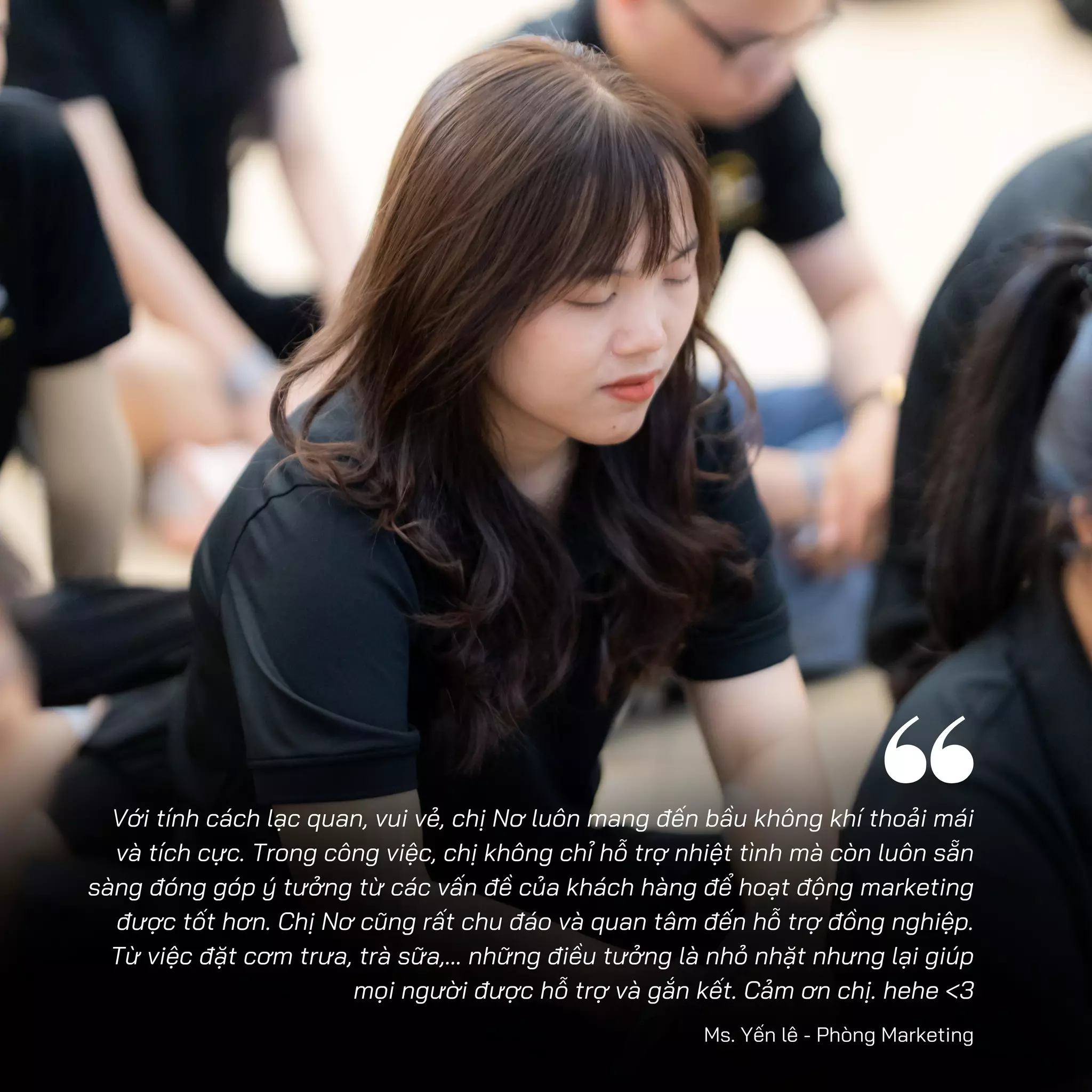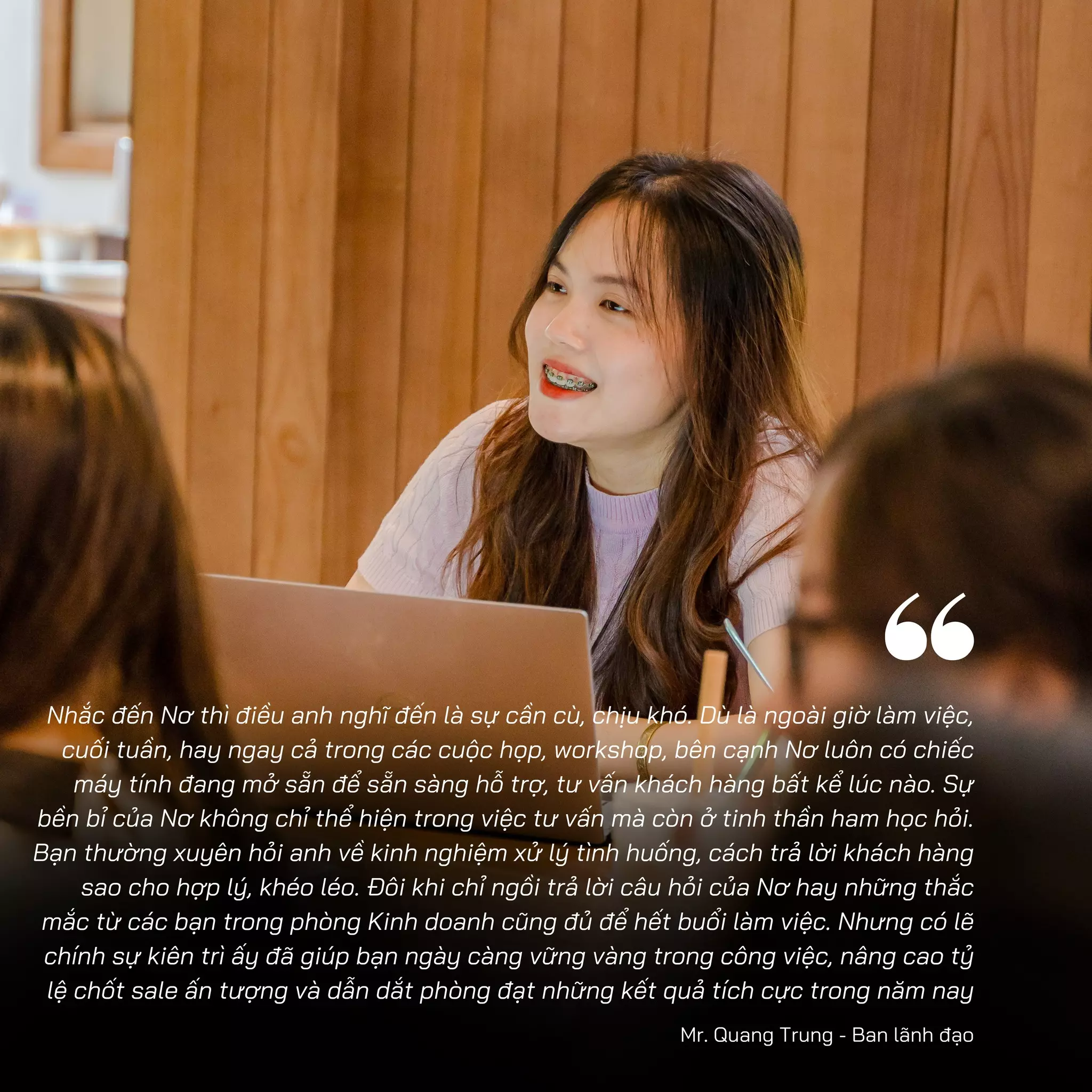 Chia sẻ về chị, anh Trung cũng đã có những ghi nhận sâu sắc: “Nhắc đến Nơ thì điều anh nghĩ đến là sự cần cù, chịu khó. Dù là ngoài giờ làm việc, cuối tuần, hay ngay cả trong các cuộc họp, workshop, bên cạnh Nơ luôn có chiếc máy tính đang mở sẵn để sẵn sàng hỗ trợ, tư vấn khách hàng bất kể lúc nào. Sự bền bỉ của Nơ không chỉ thể hiện trong việc tư vấn mà còn ở tinh thần ham học hỏi. Bạn thường xuyên hỏi anh về kinh nghiệm xử lý tình huống, cách trả lời khách hàng sao cho hợp lý, khéo léo. Đôi khi chỉ ngồi trả lời câu hỏi của Nơ hay những thắc mắc từ các bạn trong phòng Kinh doanh cũng đủ để hết buổi làm việc. Nhưng có lẽ chính sự kiên trì ấy đã giúp bạn ngày càng vững vàng trong công việc, nâng cao tỷ lệ chốt sale ấn tượng và dẫn dắt phòng đạt những kết quả tích cực trong năm nay”.