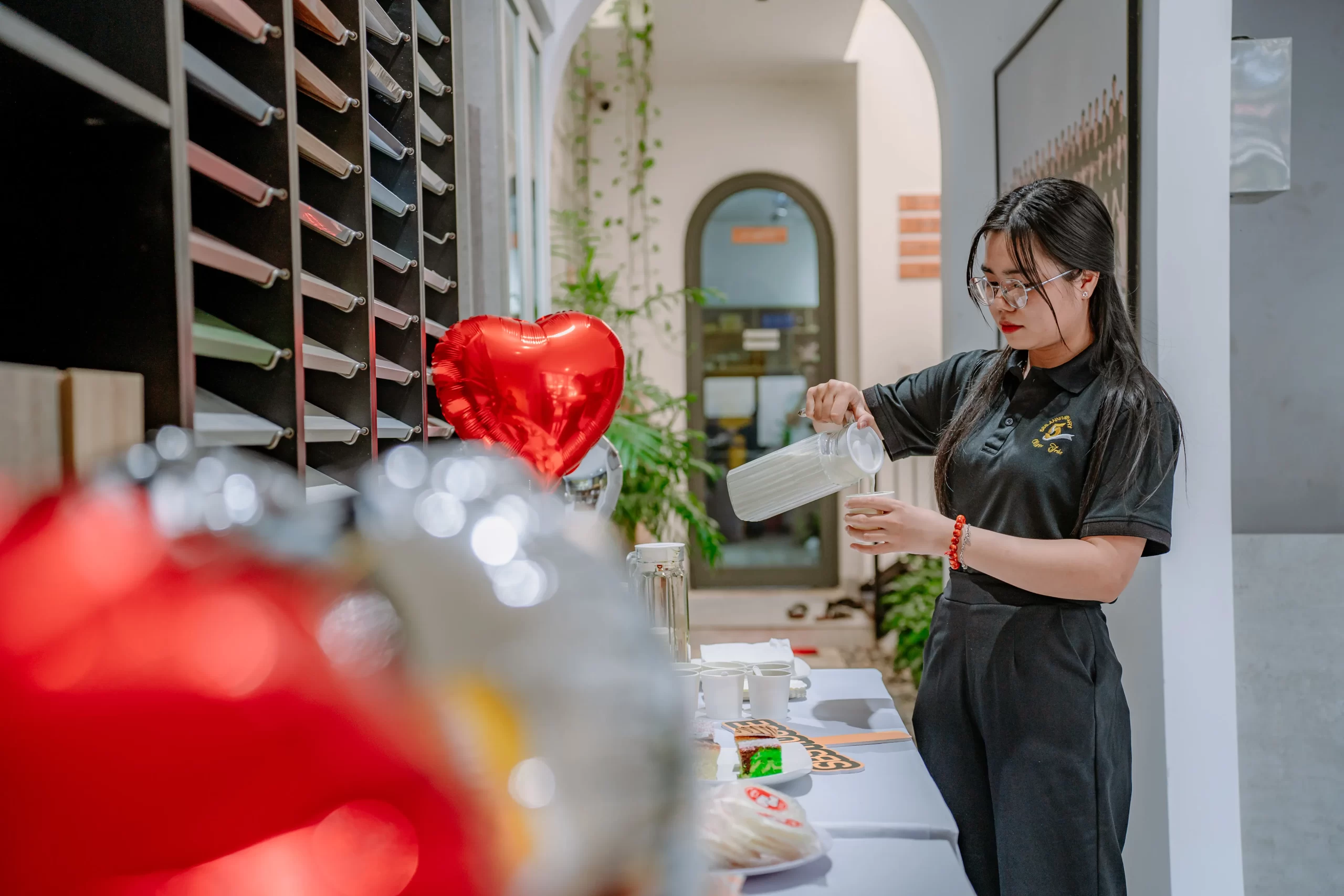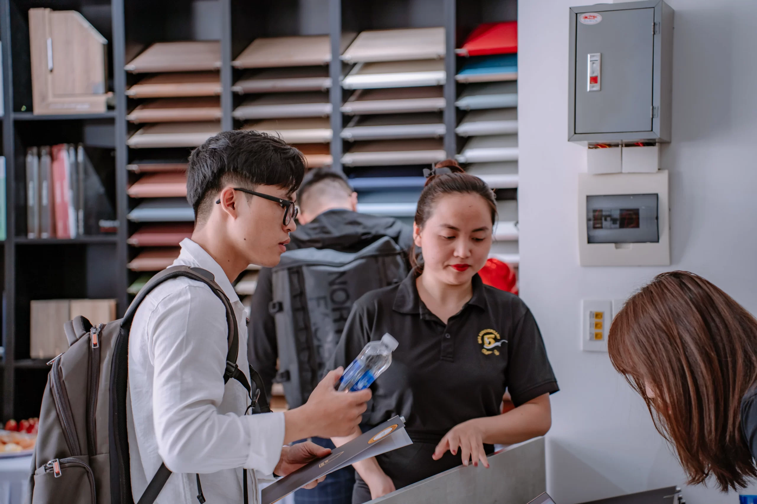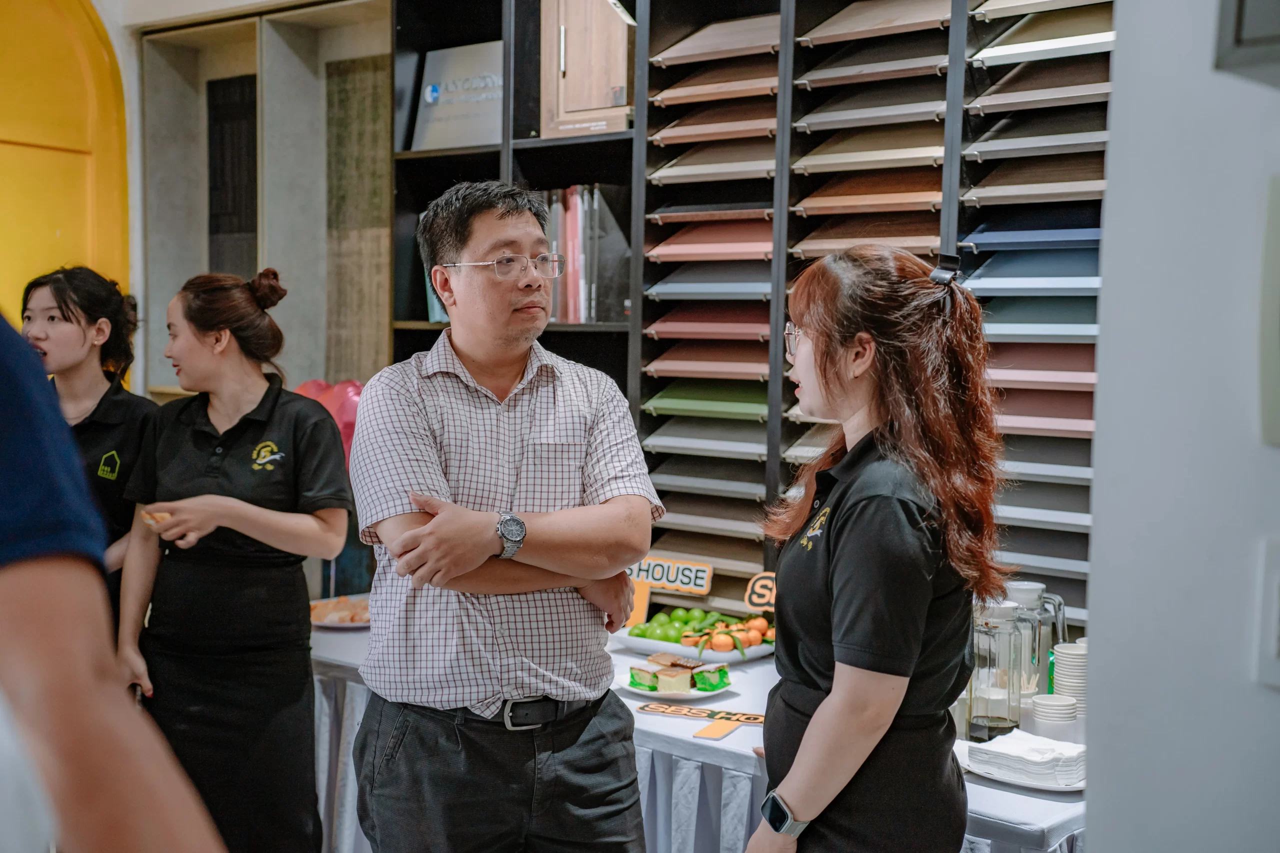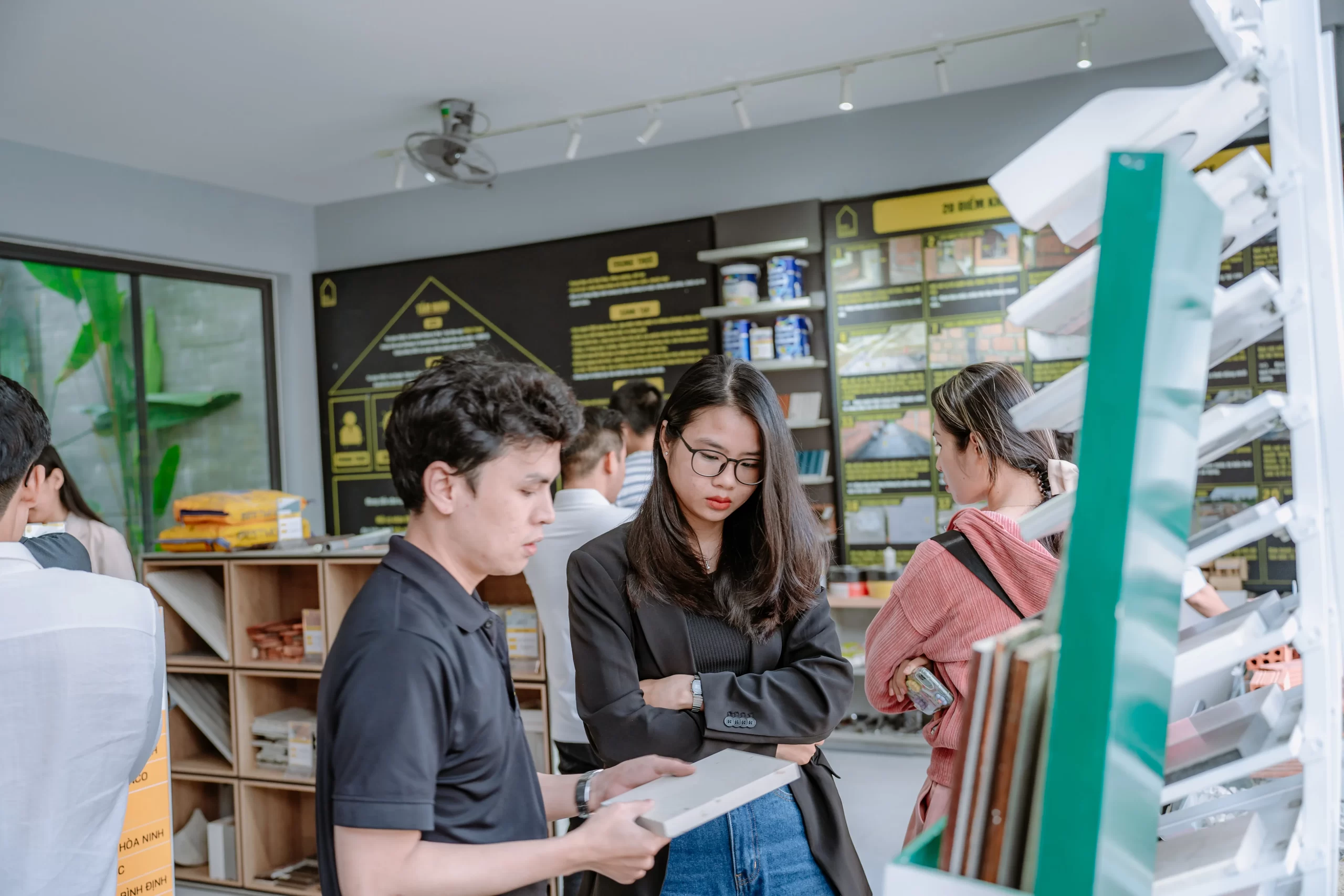 Khách mời tham quan showroom và lắng nghe chia sẻ về những loại vật liệu được sử dụng phổ biến